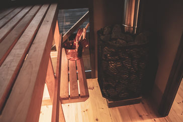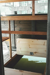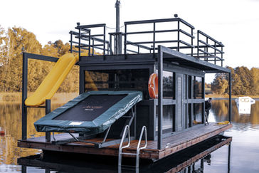 Ein kleines, entspanntes Modell mit Sauna für Naturliebhaber. Glasiertes Gebäude mit einer minimalen Größe, um die Sauna, die Lounge und die Toilette leicht unterzubringen. Ersten Stock Terrasse rund um das Gebäude und eine große Dachterrasse über die Plattform.